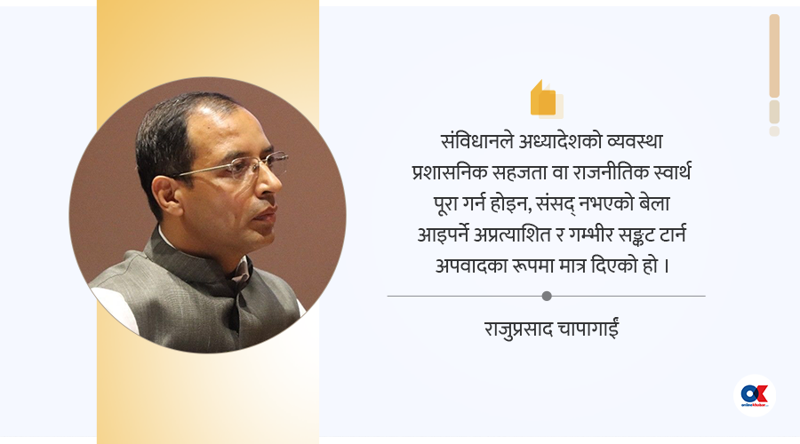 अध्यादेशको शक्ति प्रयोगका लागि संवैधानिक आवश्यकता स्थापित हुनैपर्दछ । प्रशासनिक तथा राजनीतिक सुगमताका लागि यसको दुरुपयोग संविधानतः स्वीकार्य हुँदैन । तसर्थ अहिलेको परिस्थितिमा जे-जस्ता विषयमा अध्यादेश जारी गर्न खोजिएका सङ्केतहरू देखिएका छन्, ती सर्वथा असंवैधानिक छन् । संवैधानिक, लोकतान्त्रिक, राजनीतिक, नैतिक कुनै हिसाबले पनि औचित्य पुष्टि हुँदैन । सुशासनको कार्यादेशसहित अस्तित्वमा आएको सरकारको दिमागमा यो सोच पलाउनु आफैँमा विडम्बनापूर्ण छ ।
