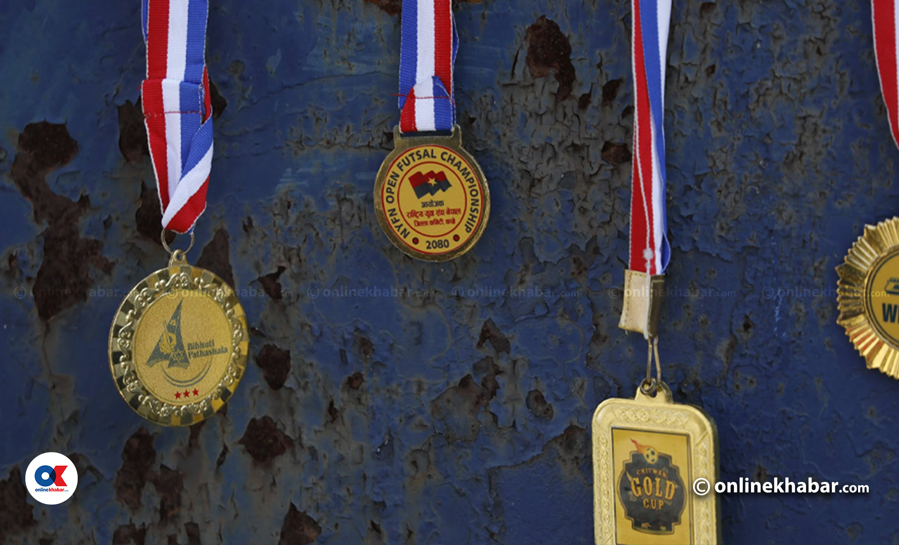 २० कात्तिक, काठमाडौं । अखिल नेपाल फुटबल संघ (एन्फा) मुख्यालयमा प्रदर्शन गर्न उत्रिएका खेलाडीहरूले गेटमै मेडल झुन्ड्याएका छन् ।