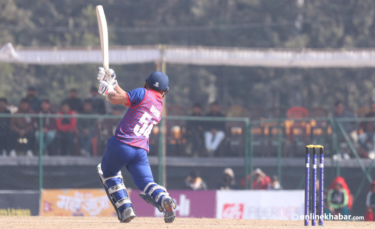 भीमको स्टेटमा सुन्दर छक्का । फिल्डर मिडअन र अफमा राखेपछि खाली ठाउँको भरपूर्ण फाइदा उठाउँदै भीमले सुन्दर छक्का हानेका हुन् । पछिल्लो खेलमा क्यानडाविरुद्ध १०१ रन बनाएका भीमले नामिबियाविरुद्ध त्यो लयलाई निरन्तरता दिएका छन् । शीर्ष चार ब्याटर गुमाएको अवस्थामा जिम्मेवारी प्रदर्शन आवश्यक पनि छ ।