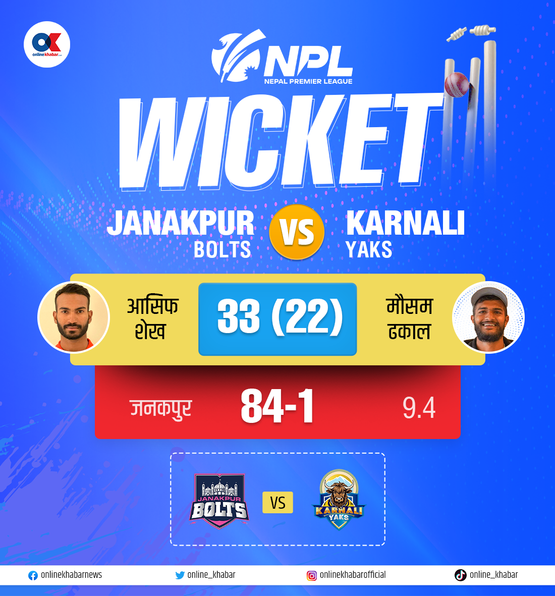 टस जितेर पहिले ब्याटिङ गरेको कर्णालीले २० ओभरमा ९ विकेट गुमाएर १४१ रन बनाएको थियो । जवाफमा जनकपुरले १५.१ ओभरमा २ विकेटको क्षतिमा लक्ष्य भेट्टायो । जनकपुरका लागि कप्तान अनिल शाहले अविजित ६२ रन बनाए ।