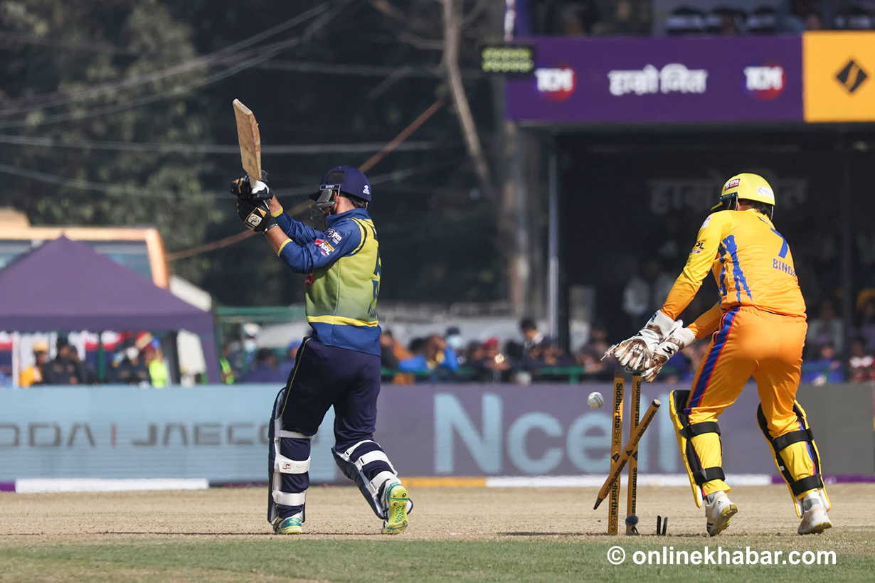 WILD SWING ! ठुलो शट खेल्न खोजेका थिए । तर आउटस्वीङ बलमा पूर्णरूपमा बिट भए ।