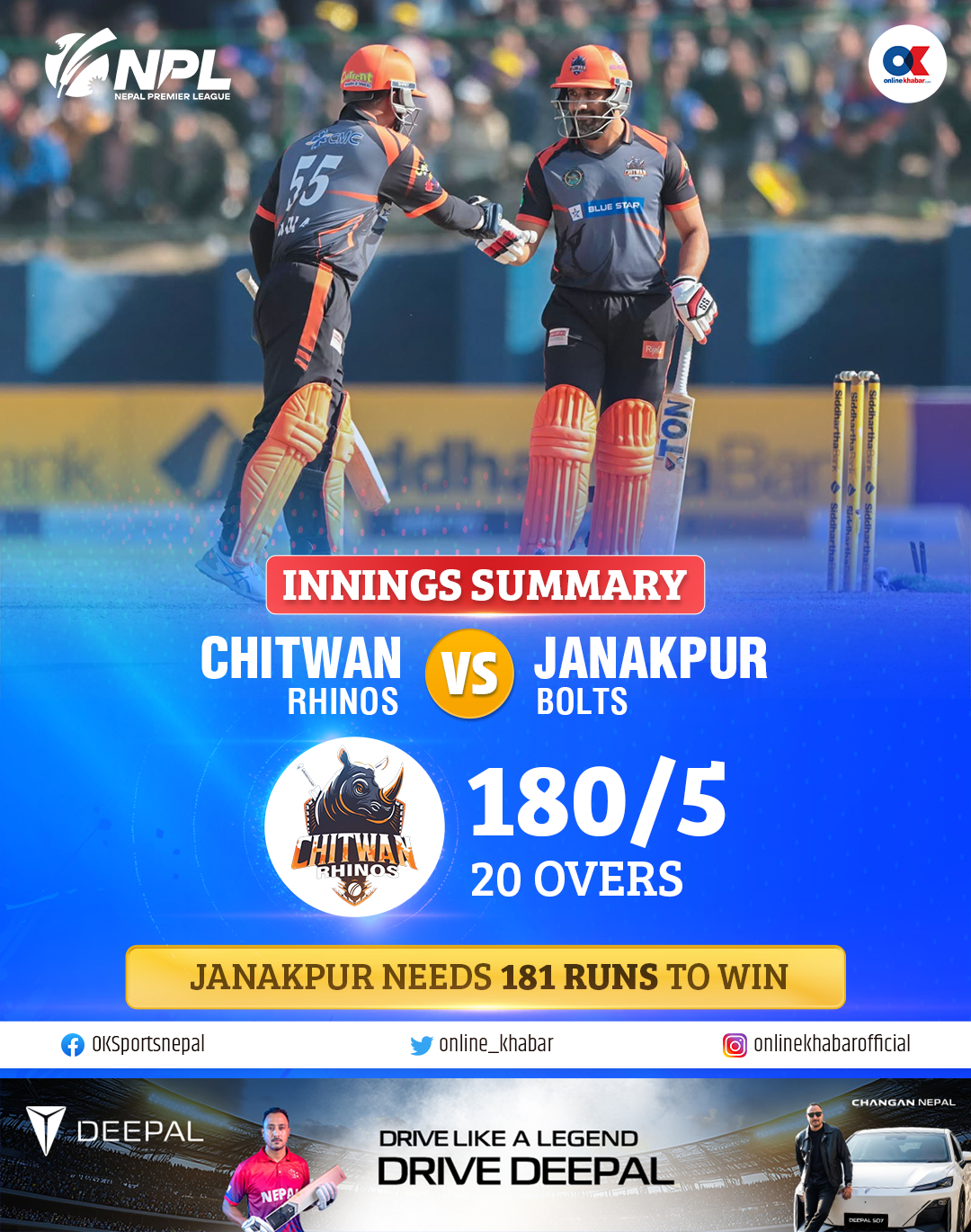 जनकपुरलाई अब खेल जित्न ३० बलमा ४२ रन आवश्यक । चितवनलाई २ विकेट आवश्यक ।
