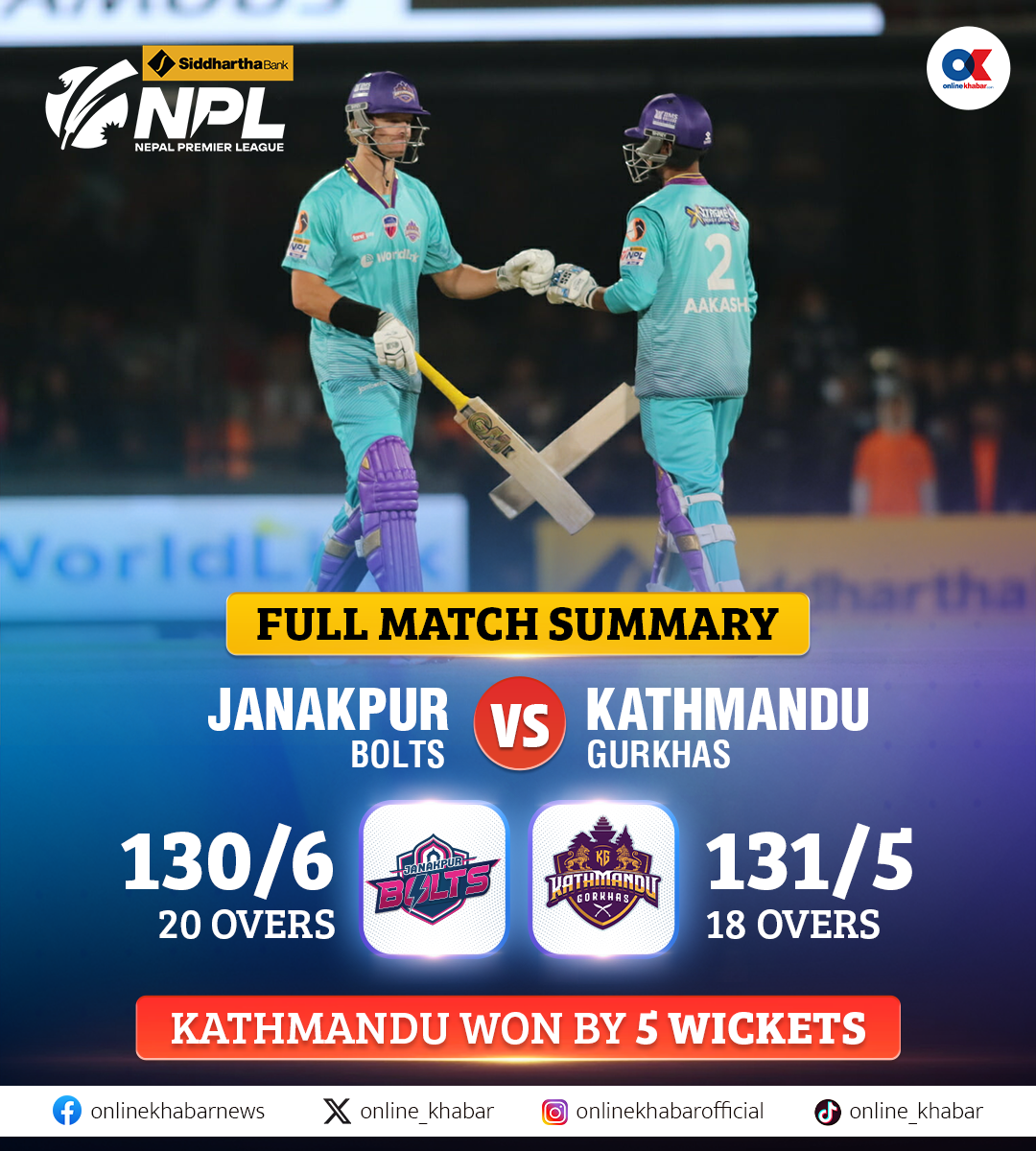 एनपीए २०२५ को उद्घाटन खेलमा काठमान्डु गोर्खाजले जनकपुर बोल्ट्सलाई हराएको छ । १३१ रनको लक्ष्य गोर्खाजले २ ओभर अगावै पूरा गर्यो ।