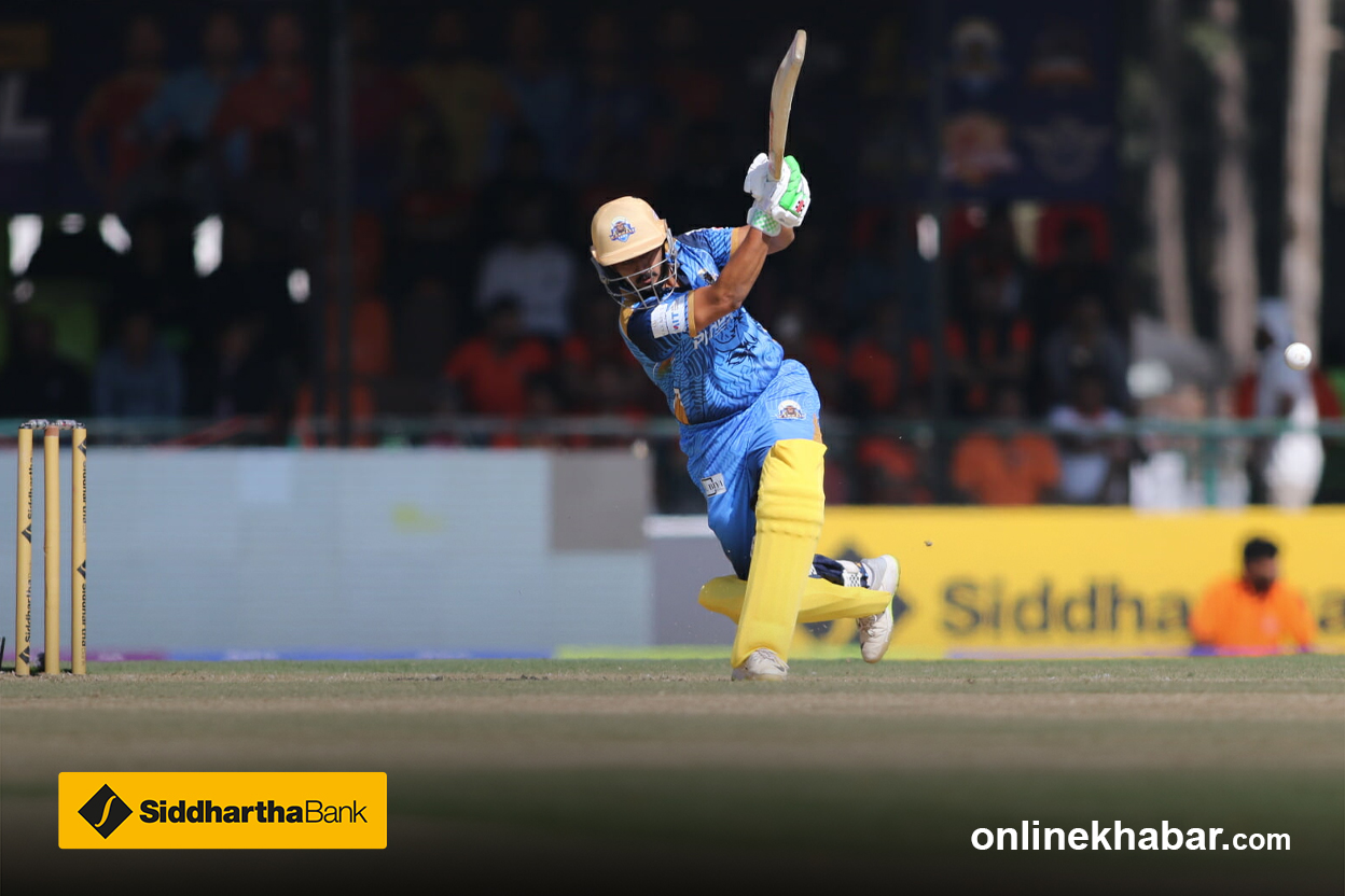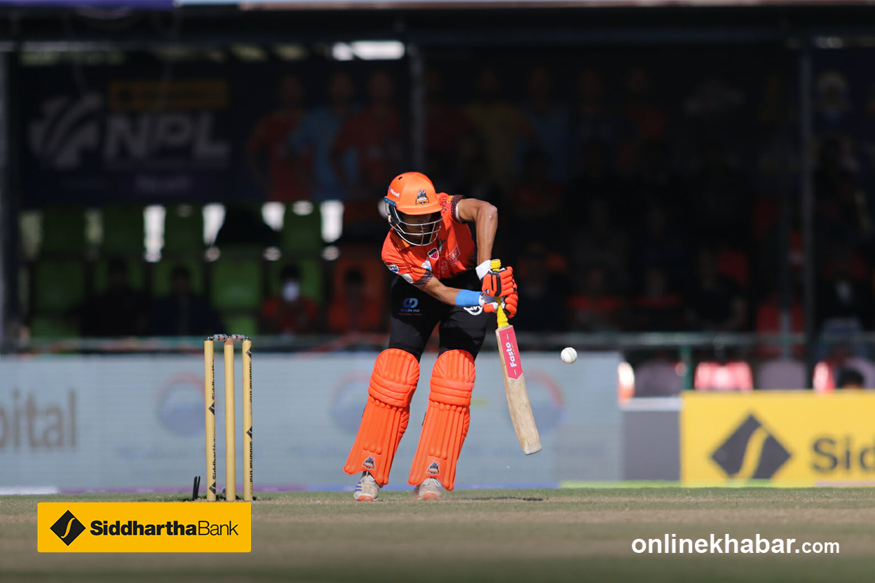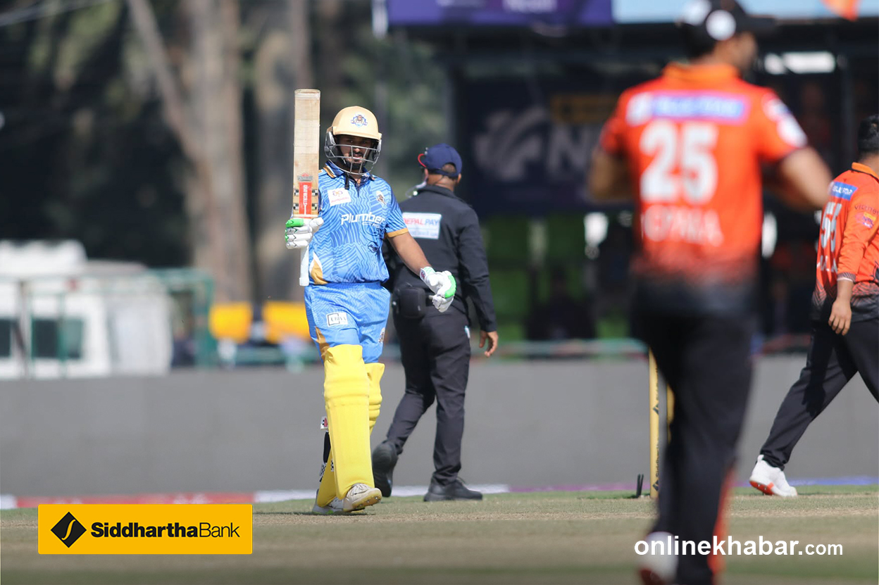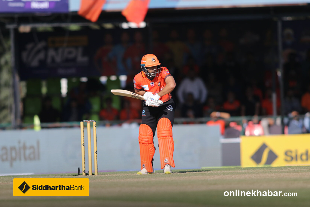 छक्काका साथ इनिङको अन्त्य गरेका छन् सर्राफले । स्लटमा थियो र सिधा अगाडि उठाएका थिए ।