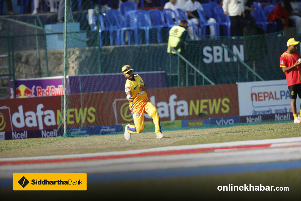 उठाएर खेलेका थिए । लङअनमा क्याच आउट भएका छन् नरेन । शटमा त्यति पावर थिएन । लङअनमा भीम सार्कीले क्याच पूरा गरे ।