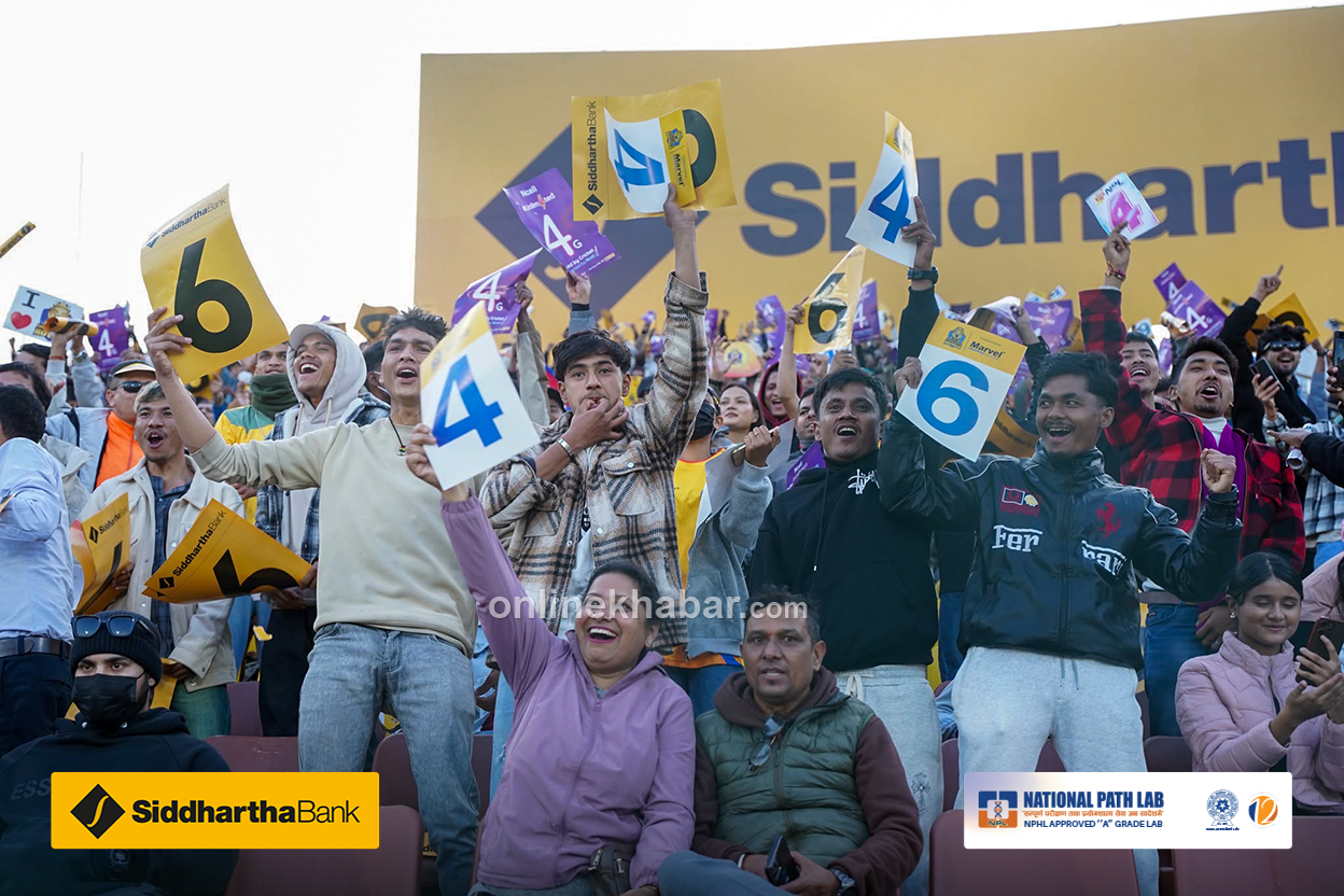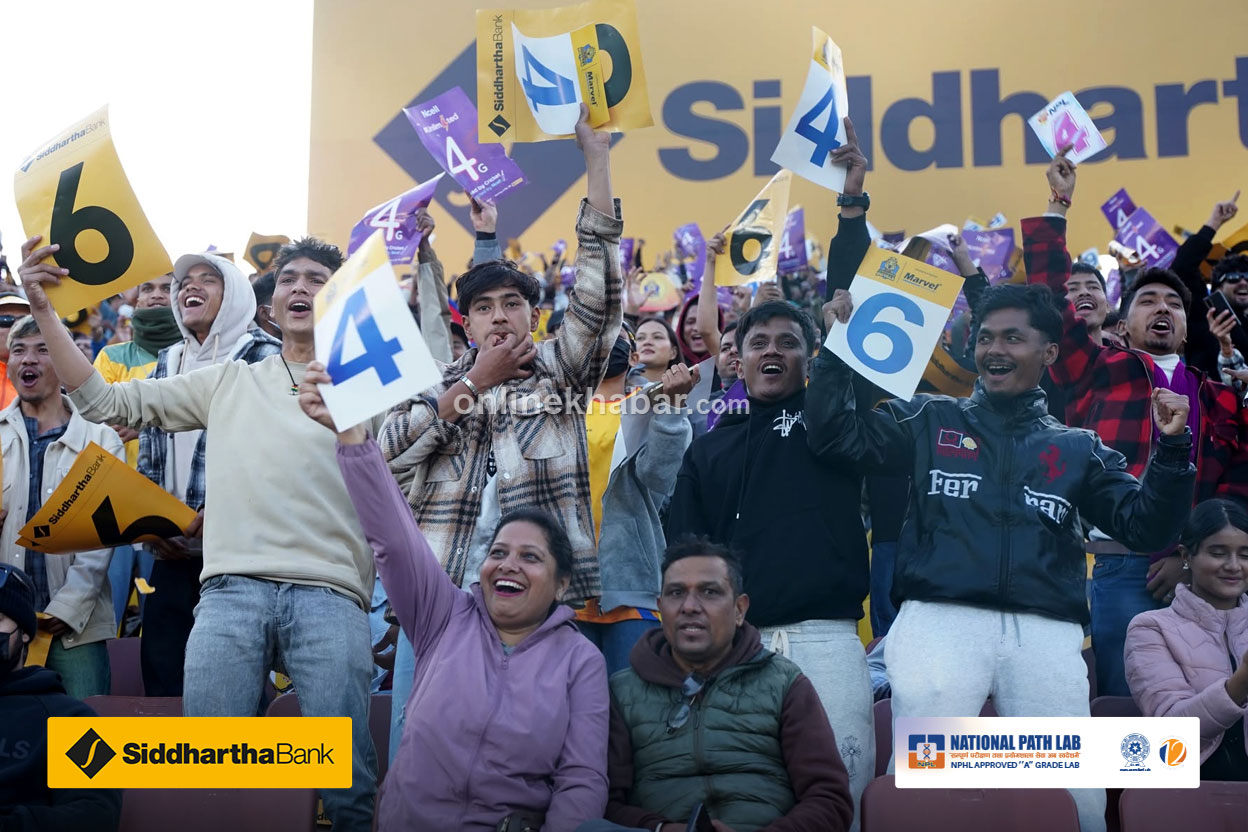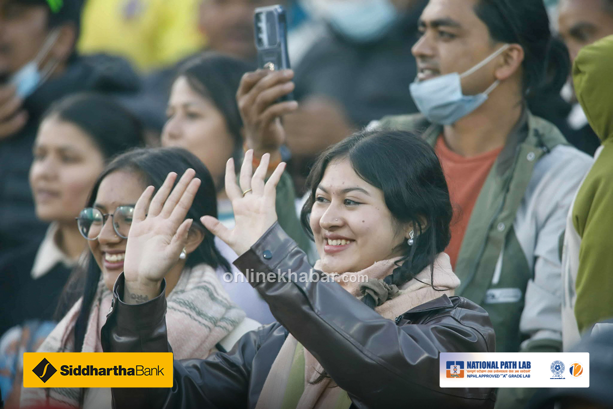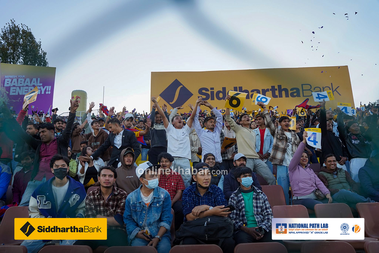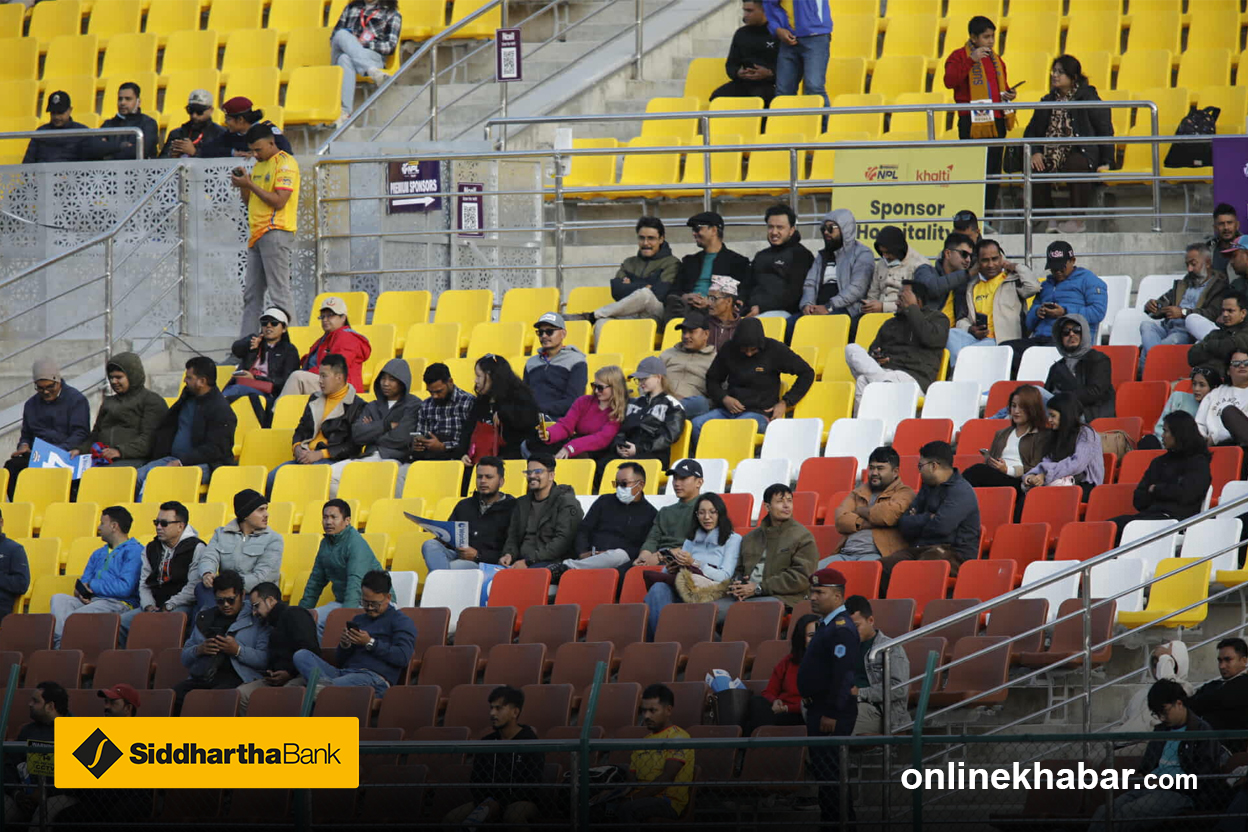 एनपीएलको तेस्रो दिन काठमान्डू गोर्खाज र सुदूरपश्चिम रोयल्सबीच स्पर्धा खेल चलिरहँदा टियू क्रिकेट मैदानमा दर्शकको रौनक ।