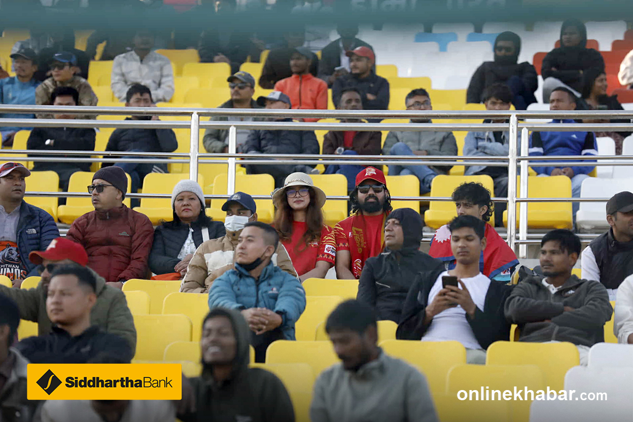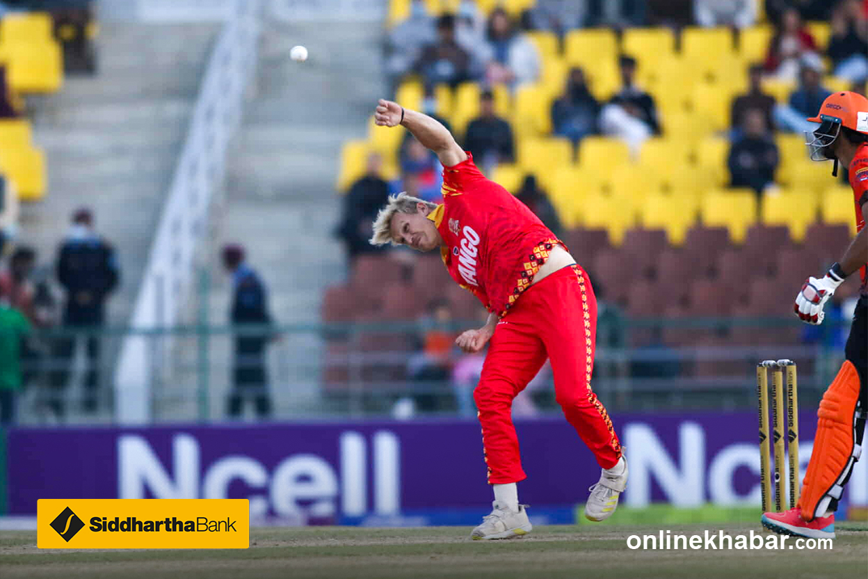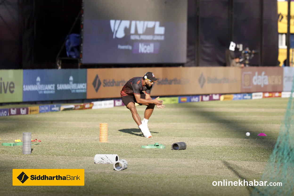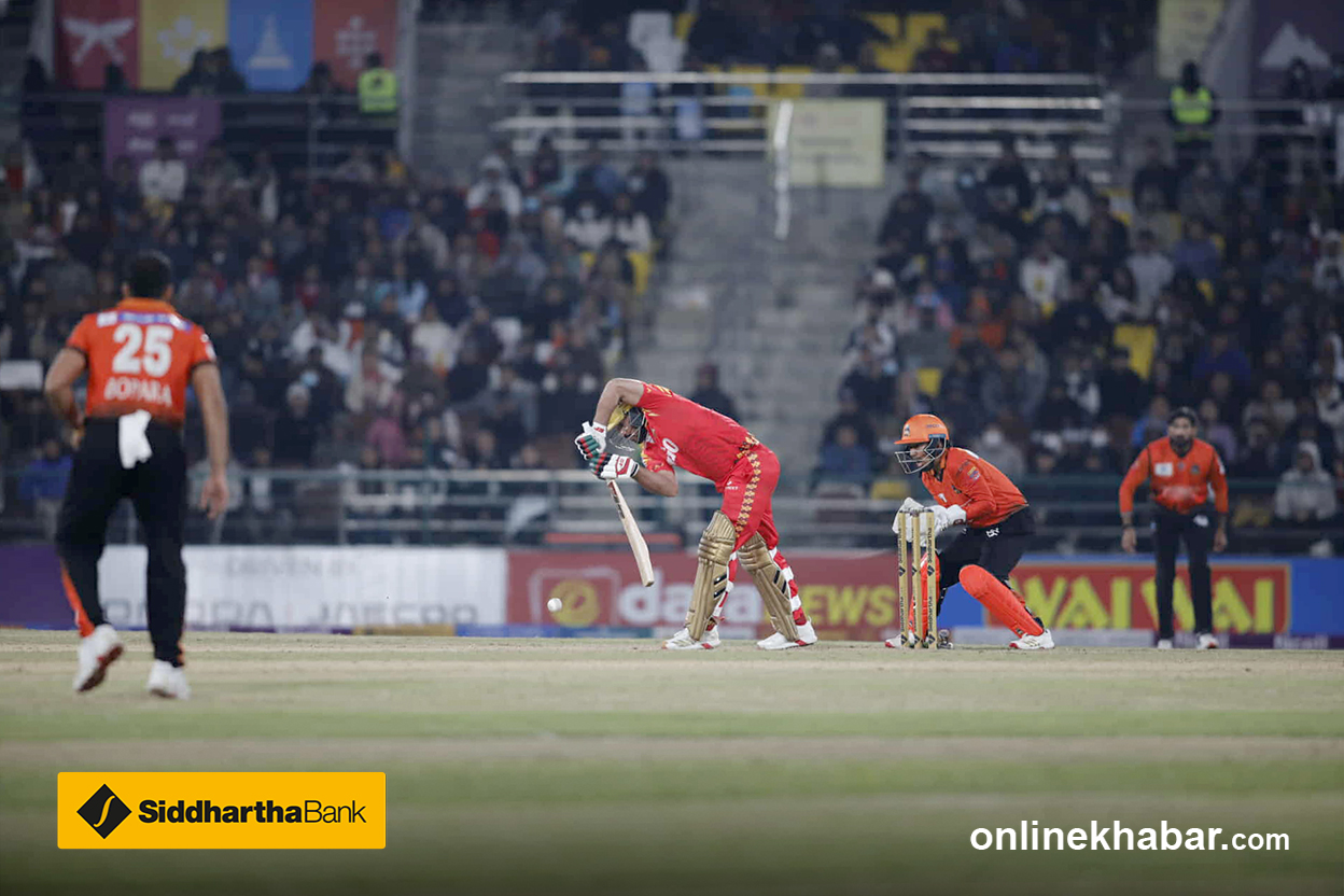 तनभिरले हावामा शट खेलेका छन् । तर बलले दूरी प्राप्त गरेको छैन । लङअनमा रहेका सन्दीप जोराले क्याच लिएका छन् ।