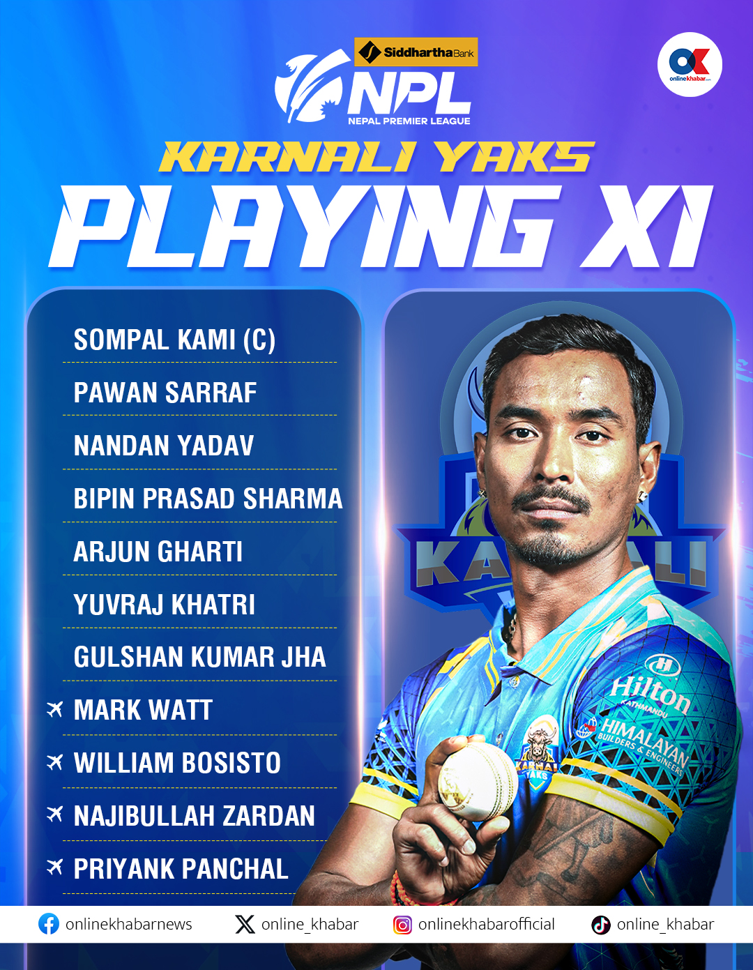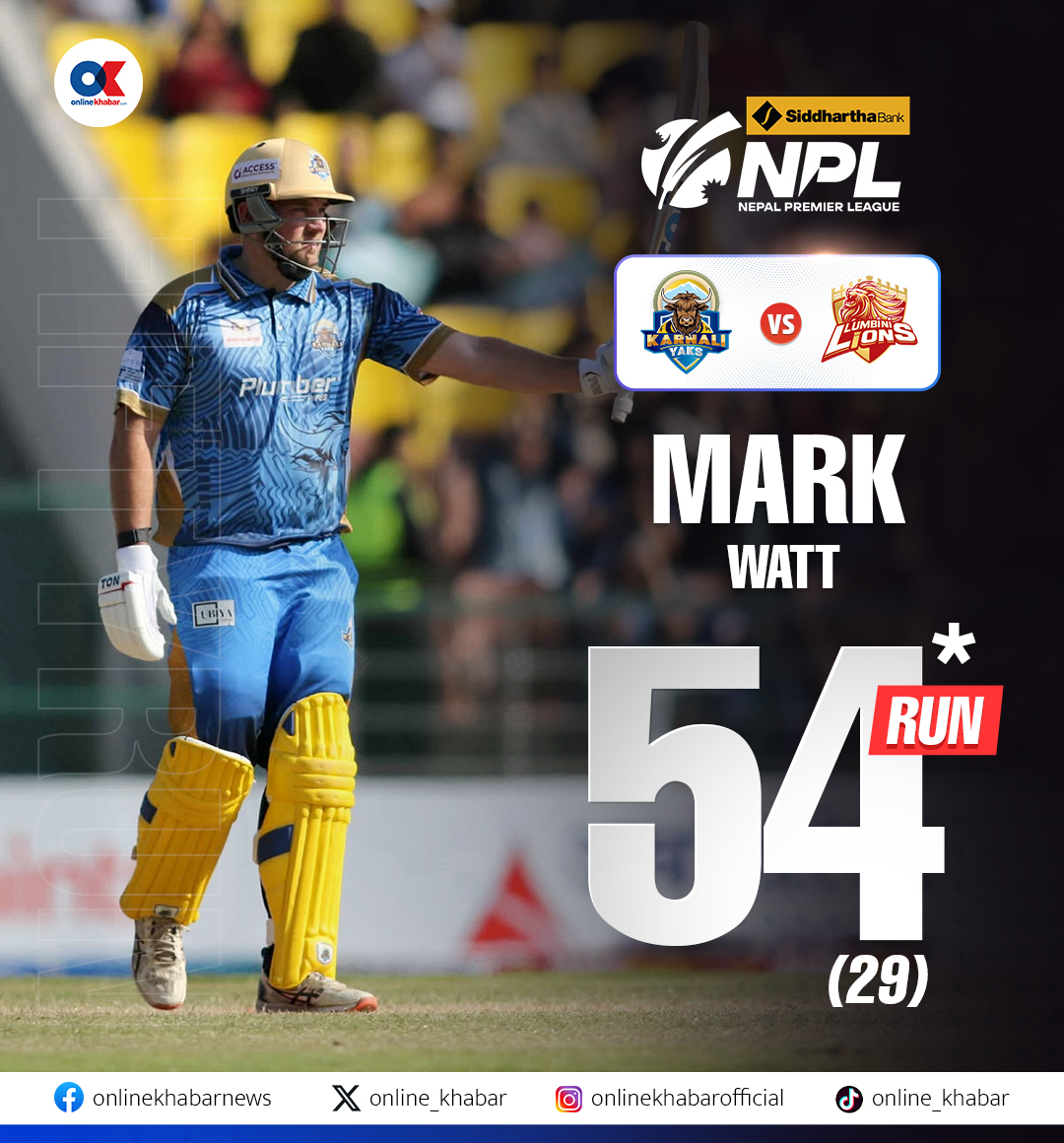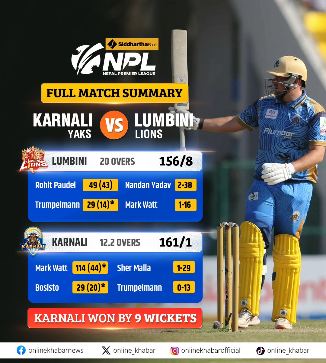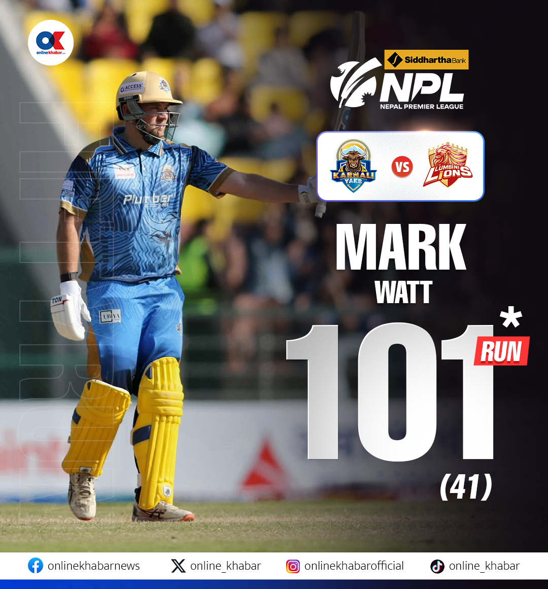 WHAT A BATTING ! मार्क वाटले वान म्यान शो देखाएका छन् यहाँ । ६ चौका र १२ छक्का मद्दतमा अविजित ११४ रन बनाएका छन् । १५७ रनको लक्ष्य कर्णालीले ४६ बल बाँकी छँदा पूरा गरेको छ ।