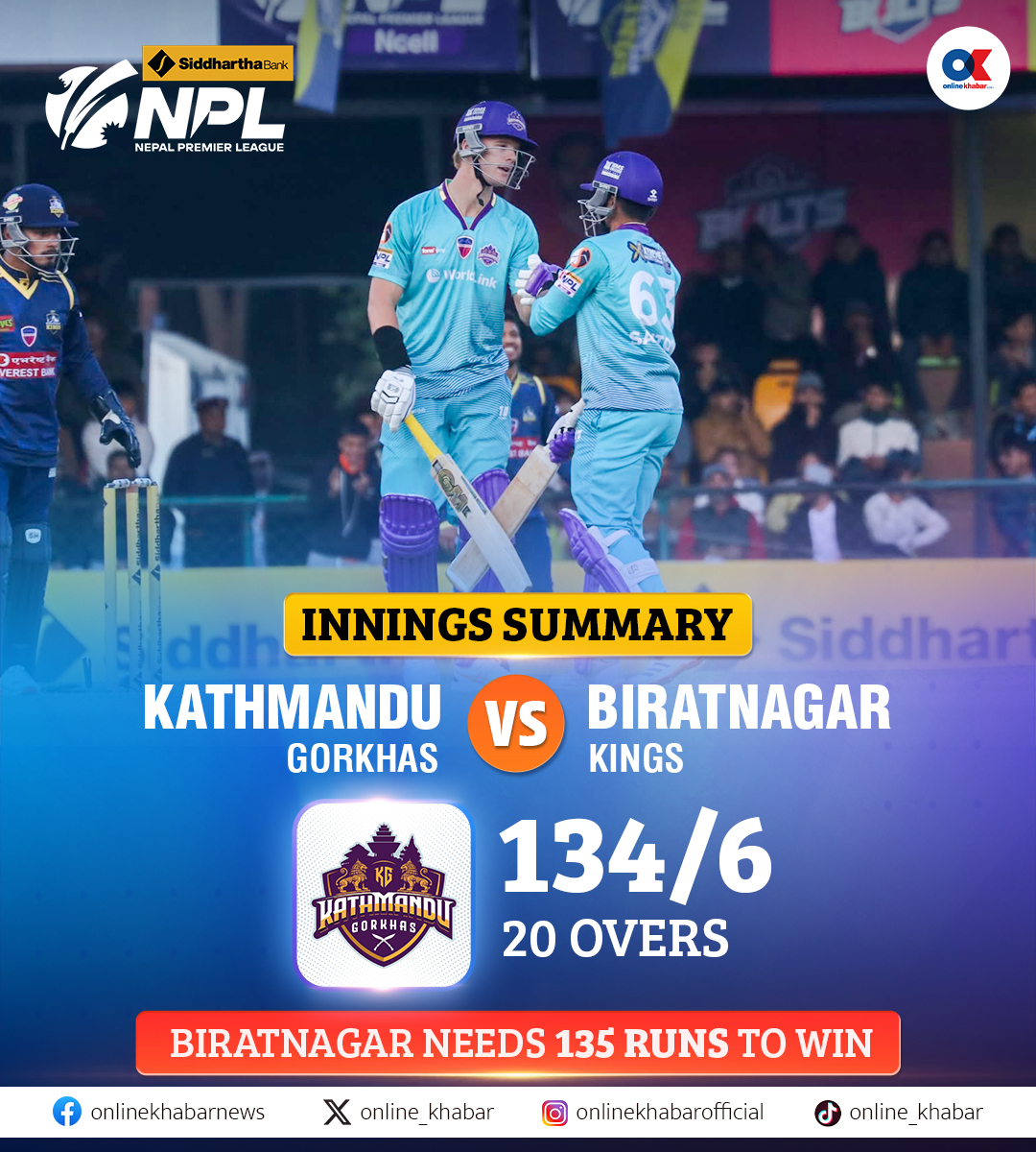 DRINKS !!! १० ओभर सकिँदा विराटनगरले ३ विकेट गुमाएर ९० रन बनाएको छ । अब ६० बलमा ४५ रन आवश्यक छ ।