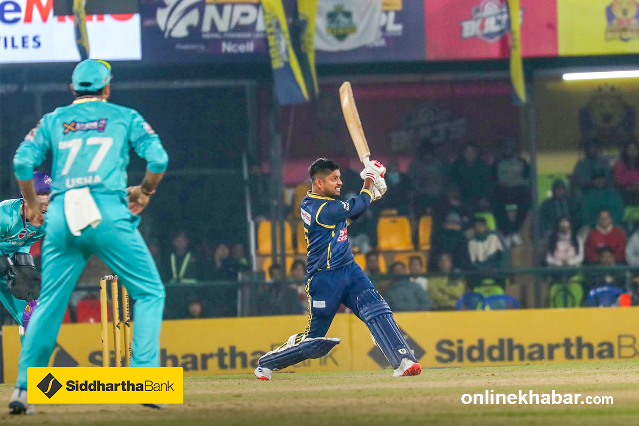 स्लग स्वीपको प्रयास थियो । बल सिधा माथि उठ्यो । सूर्य तामाङ आफैंले क्याच लिएका छन् । काठमान्डुलाई चौथो झट्का