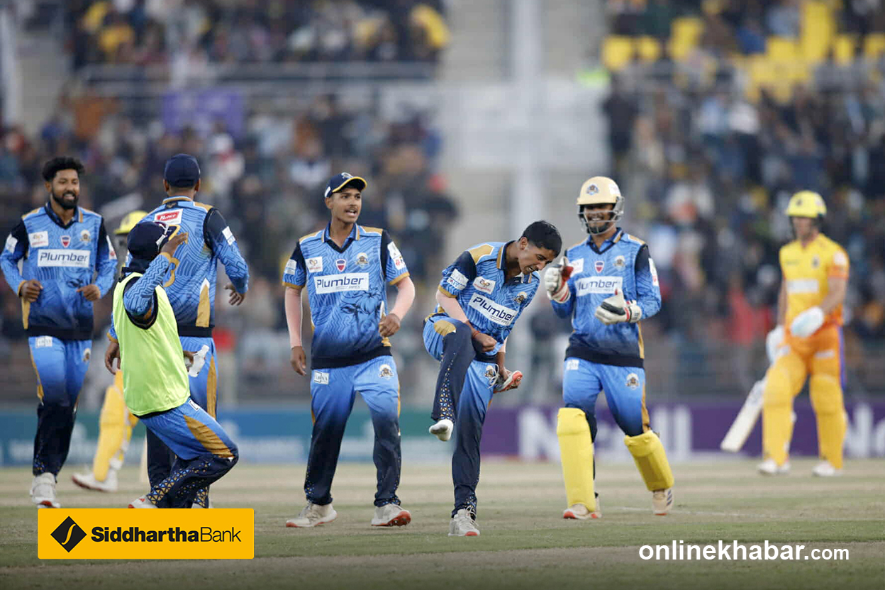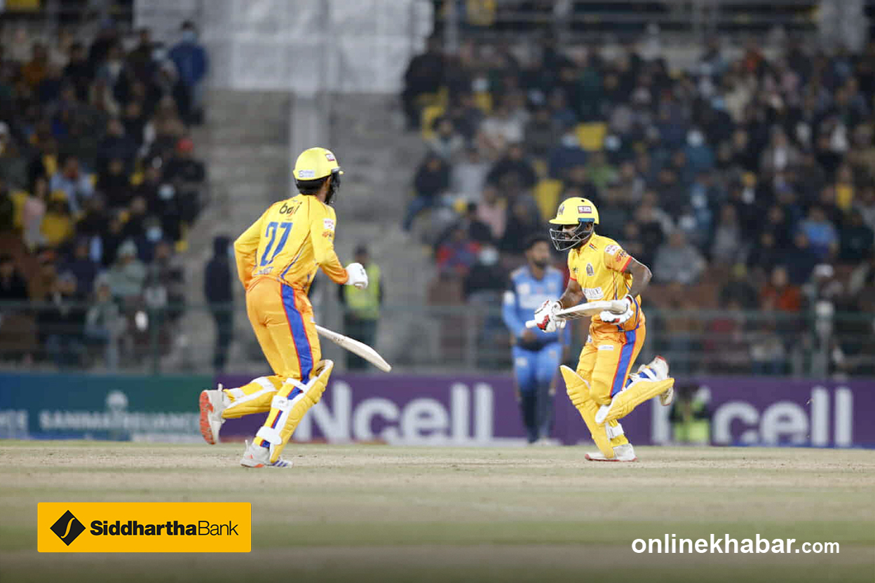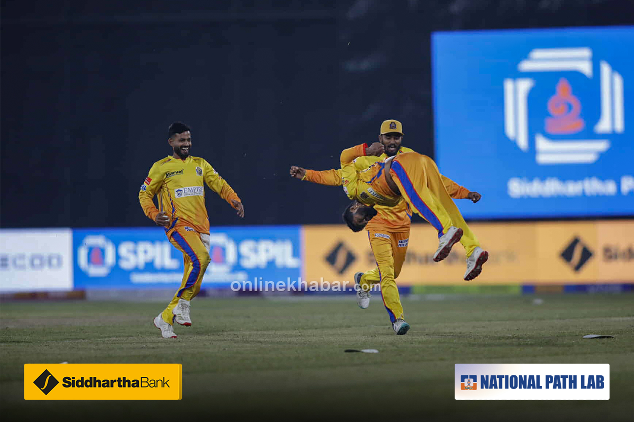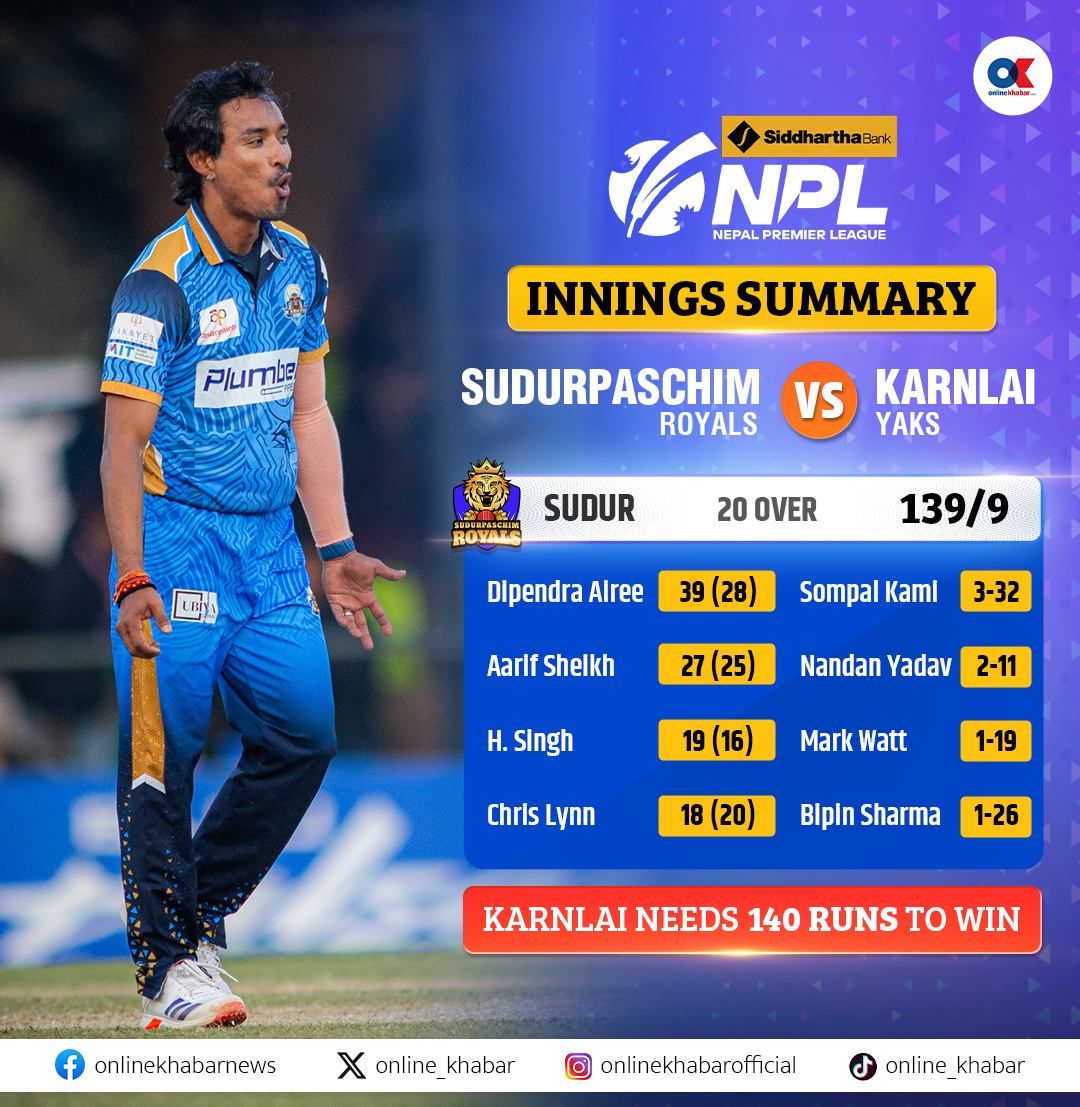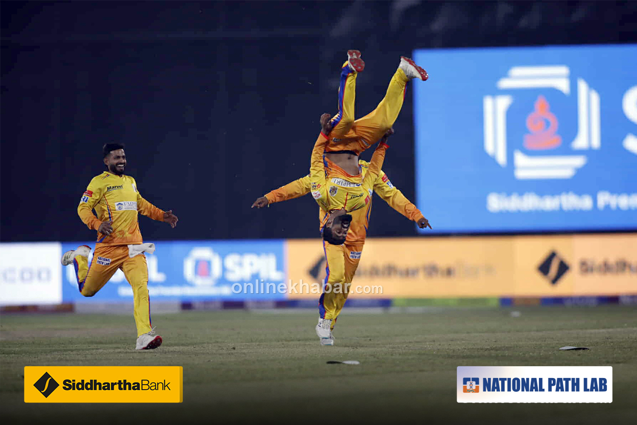योसँगै आजको खेलको बल बाइ बल अपडेटबाट गोविन्दराज नेपाल र प्रतिक भट्टसहित अनलाइनखबर टिम बिदा माग्न चाहन्छौं । भोलि एक खेल मात्र हुँदैछ । काठमान्डु गोर्खाज र लुम्बिनी लायन्सबीचको खेलको लाइभ अपडेट लिएर उपस्थित हुनेछौं । आजका लागि बिदा माग्न चाहन्छौं । अनलाइनखबर फलो गर्दै गर्नुहोला । नमस्कार, शुभ रात्रि ।