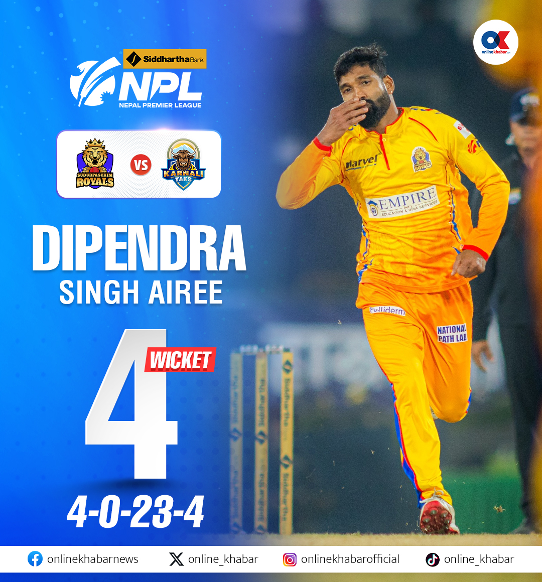 सुदूरपश्चिमका कप्तान दीपेन्द्र सिंह ऐरी आज बलिङमा चम्किएका छन् । उनले पावर प्लेमै ३ ओभर बलिङ गर्दै ३ विकेट लिएर कर्णालीको टप अर्डर ध्वस्त बनाएका छन् ।