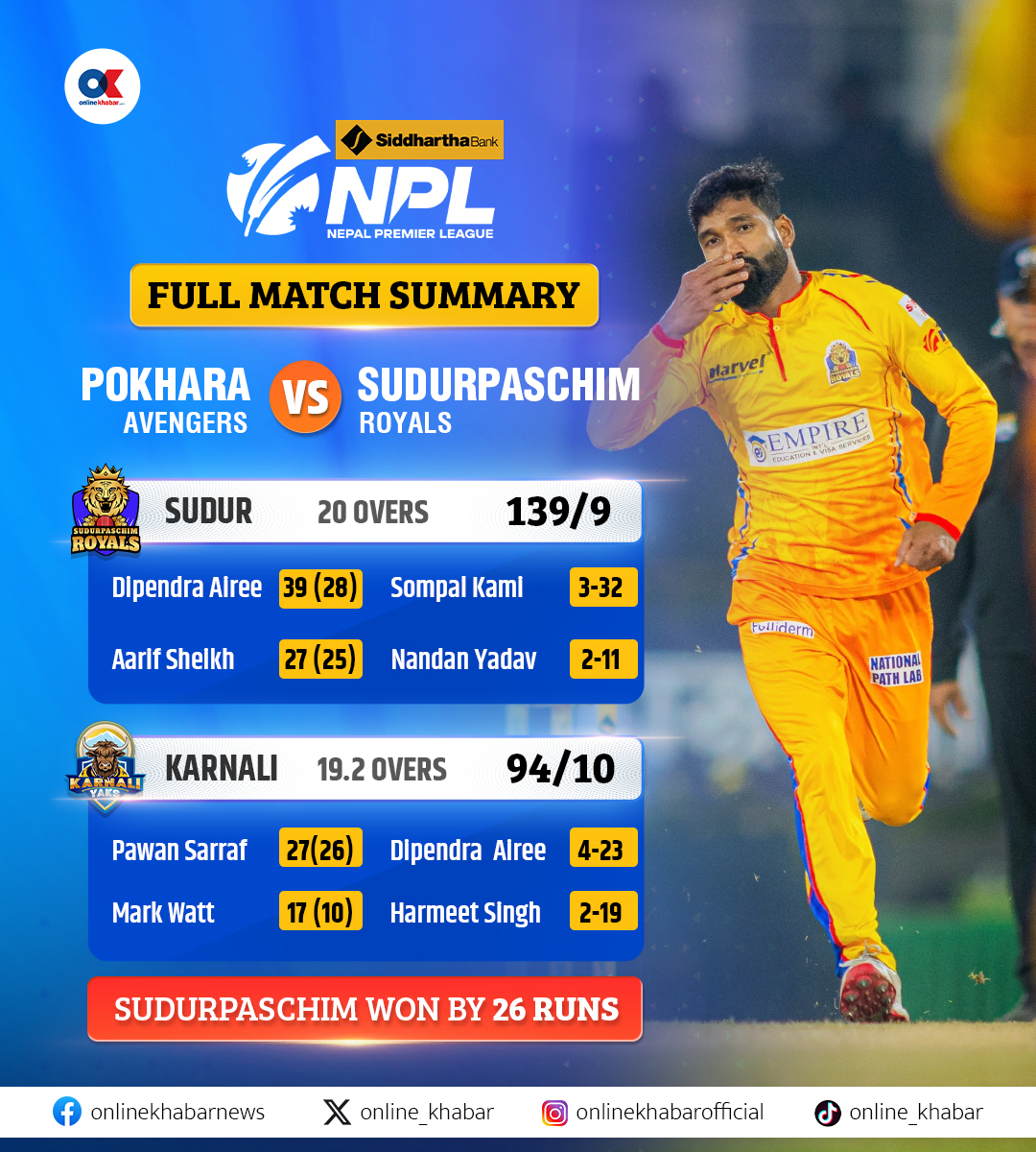 सुदूरका लागि कप्तान दीपेन्द्र बलिङमा चम्किए । उनले कर्णालीको टप अर्डरका प्रियांक पान्चाल, मार्क वाटलाई आउट गरे भने मिडल अर्डरका नजिबुल्लाह जाद्रान र गुल्शन झाको महत्वपूर्ण विकेट लिए । ब्याटिङमा पनि उनले सर्वाधिक ३९ रन बनाएका थिए । खेलको नायक उनी नै रहे ।