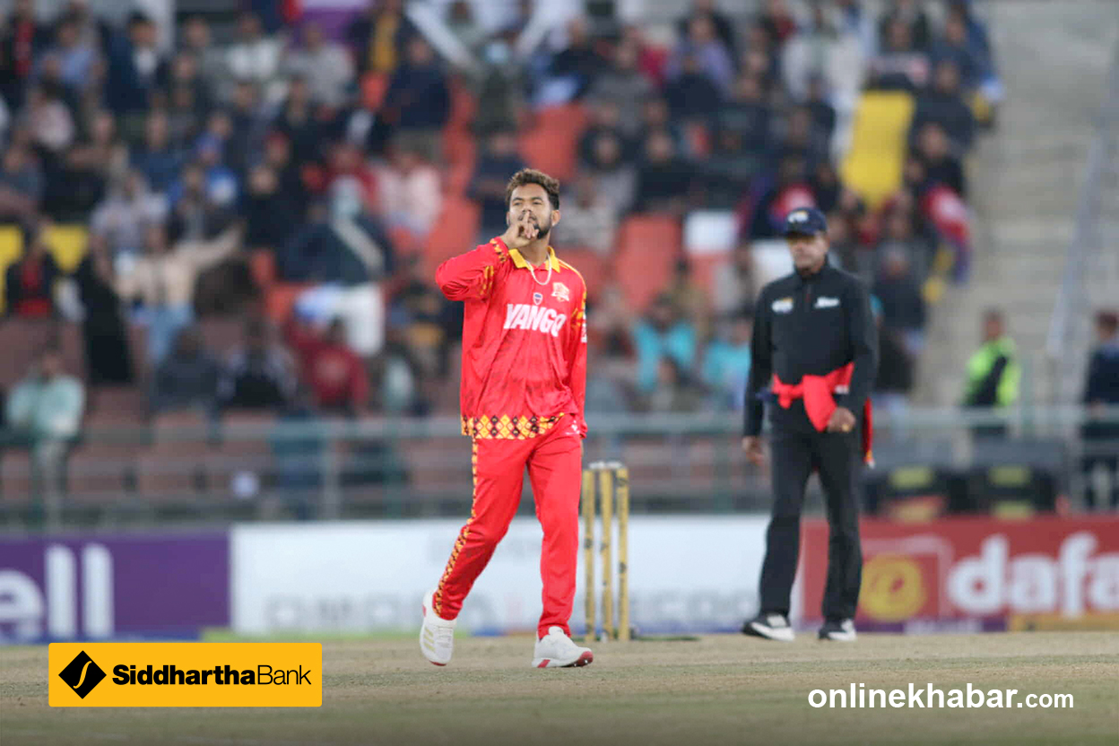 शेर मल्लको बलमा आकाश त्रिपाठी - १ रन