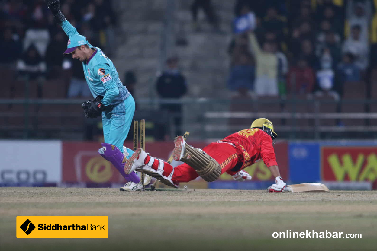 शेर मल्लको बलमा आकाश त्रिपाठी - १ रन