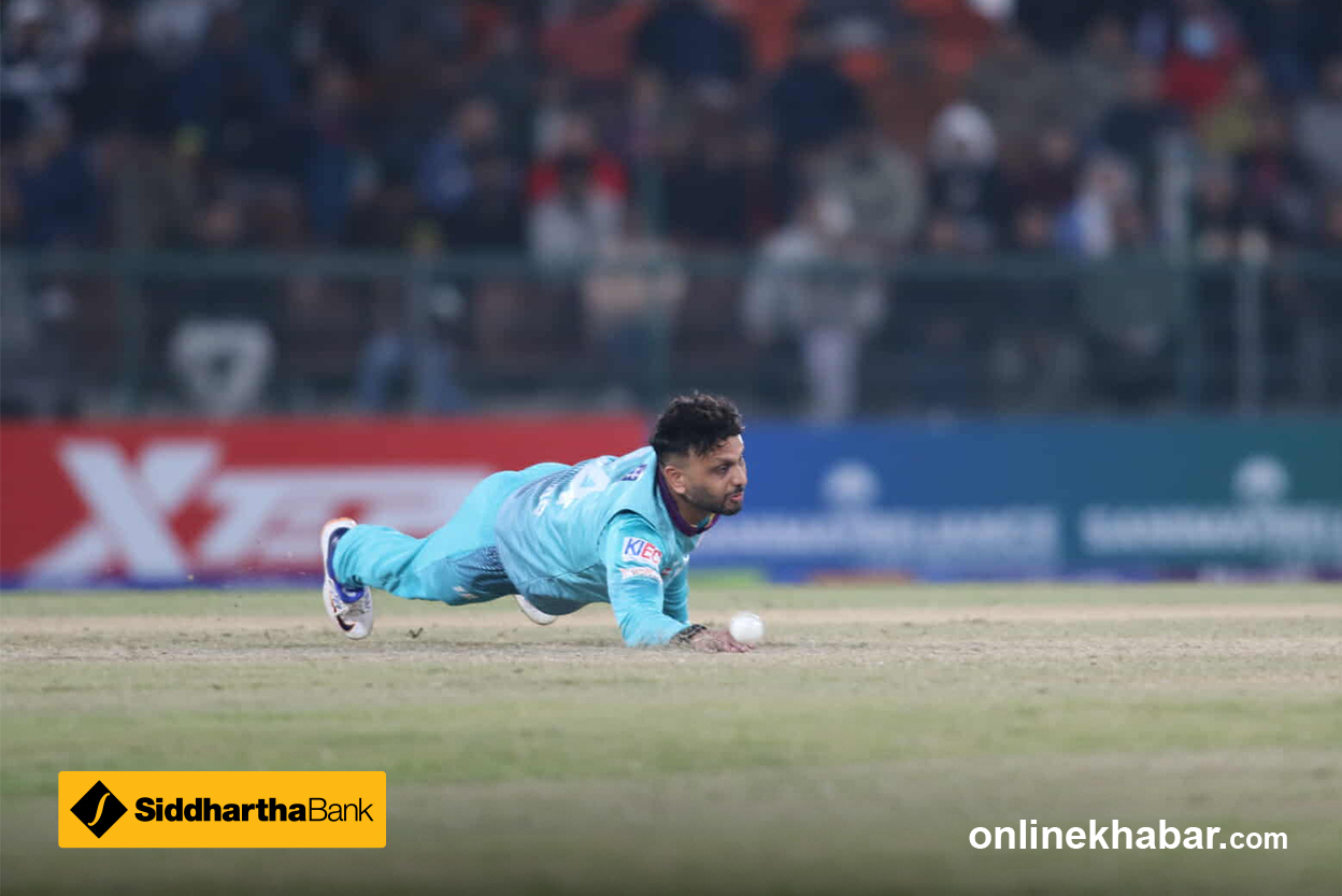 रिभर्स खेलेका थिए । सिधै पोइन्टका फिल्डर डार्शी शर्टको हातमा गएको छ बल । यो सफ्ट डिसमिसल आकाश त्रिपाठीका लागि । शेर मल्लले दोस्रो विकेट प्राप्त गरेका छन् ।