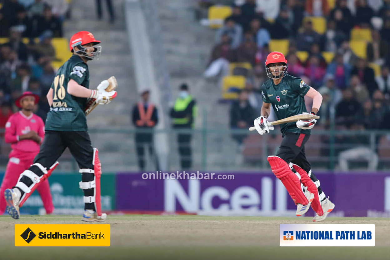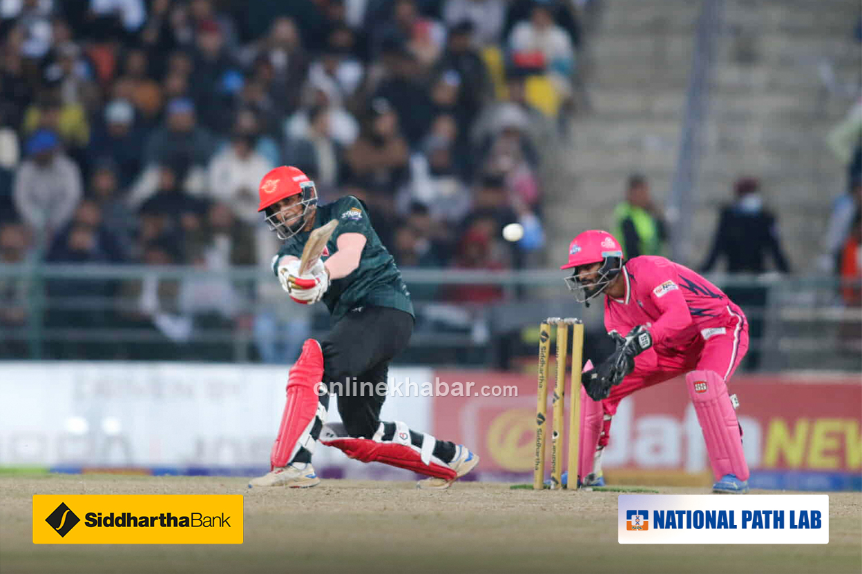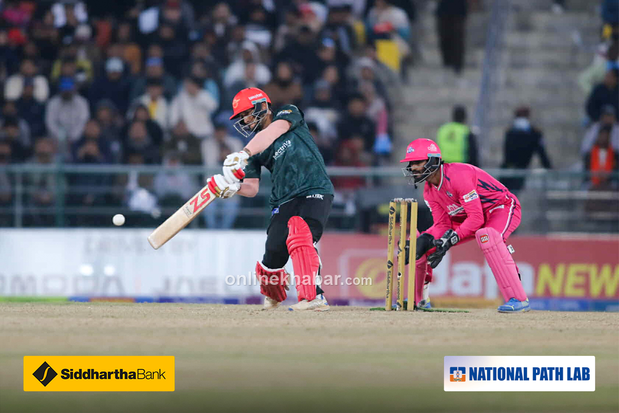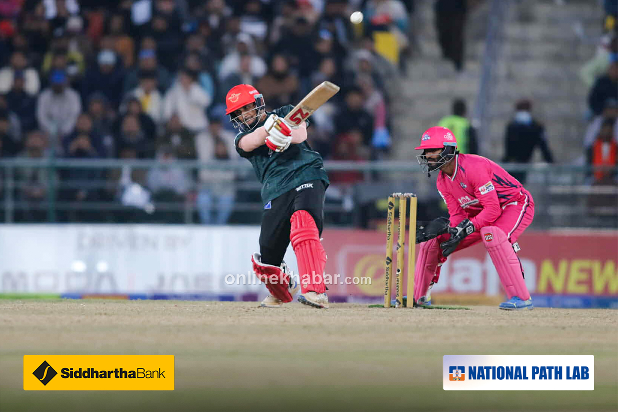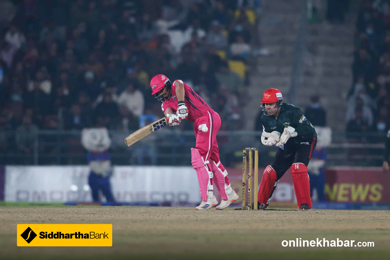 लङअनमा खेलेका छन् । छक्का भएको छ । सुमितले पोखराको इनिङ सम्हालिरहेका छन् ।