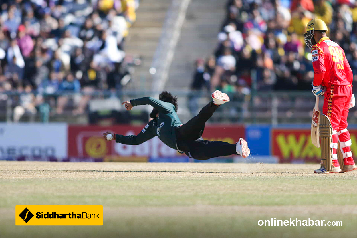 स्लग स्वीप गरेका थिए । बल धेरै माथि उठेको छ दूरी छैन । शेर मल्लले क्याच पूरा गरेका छन् ।