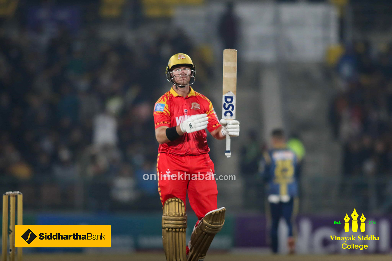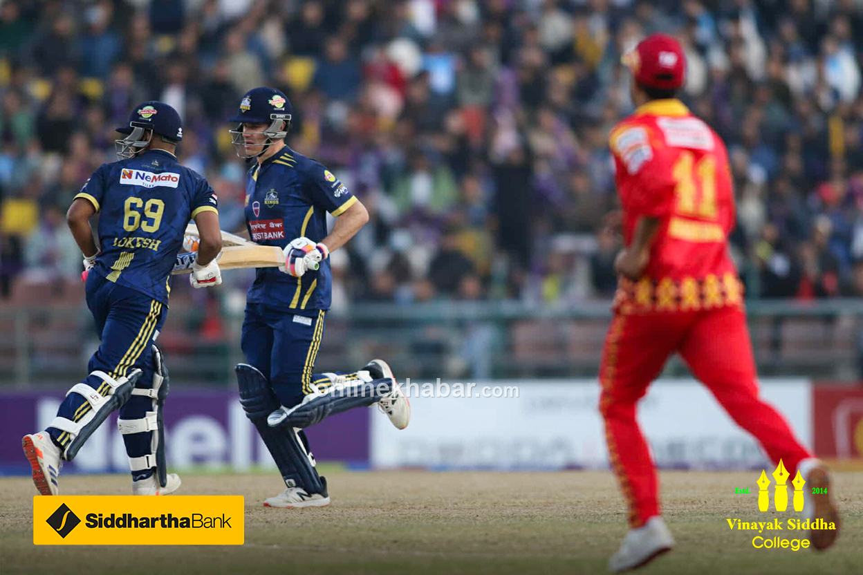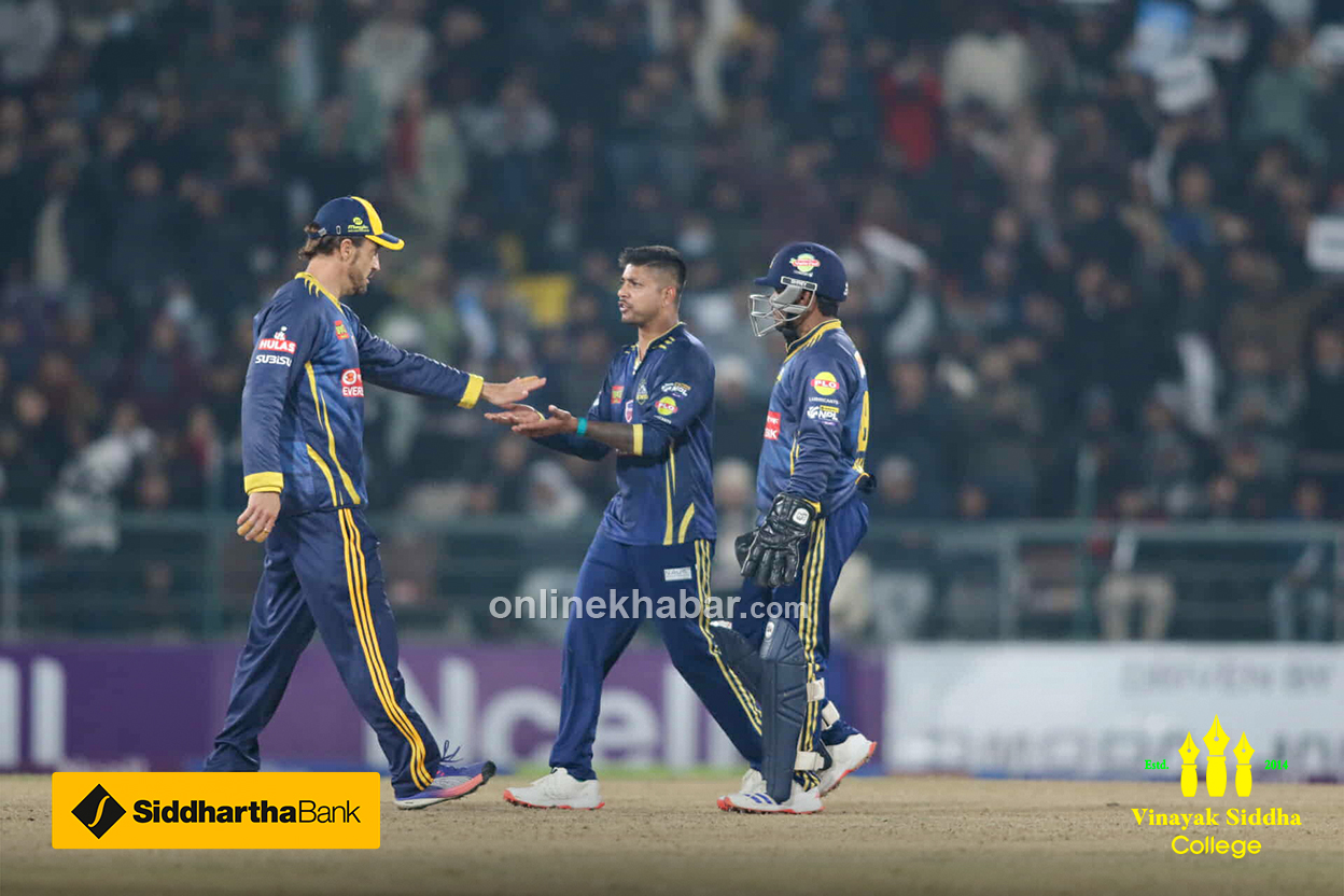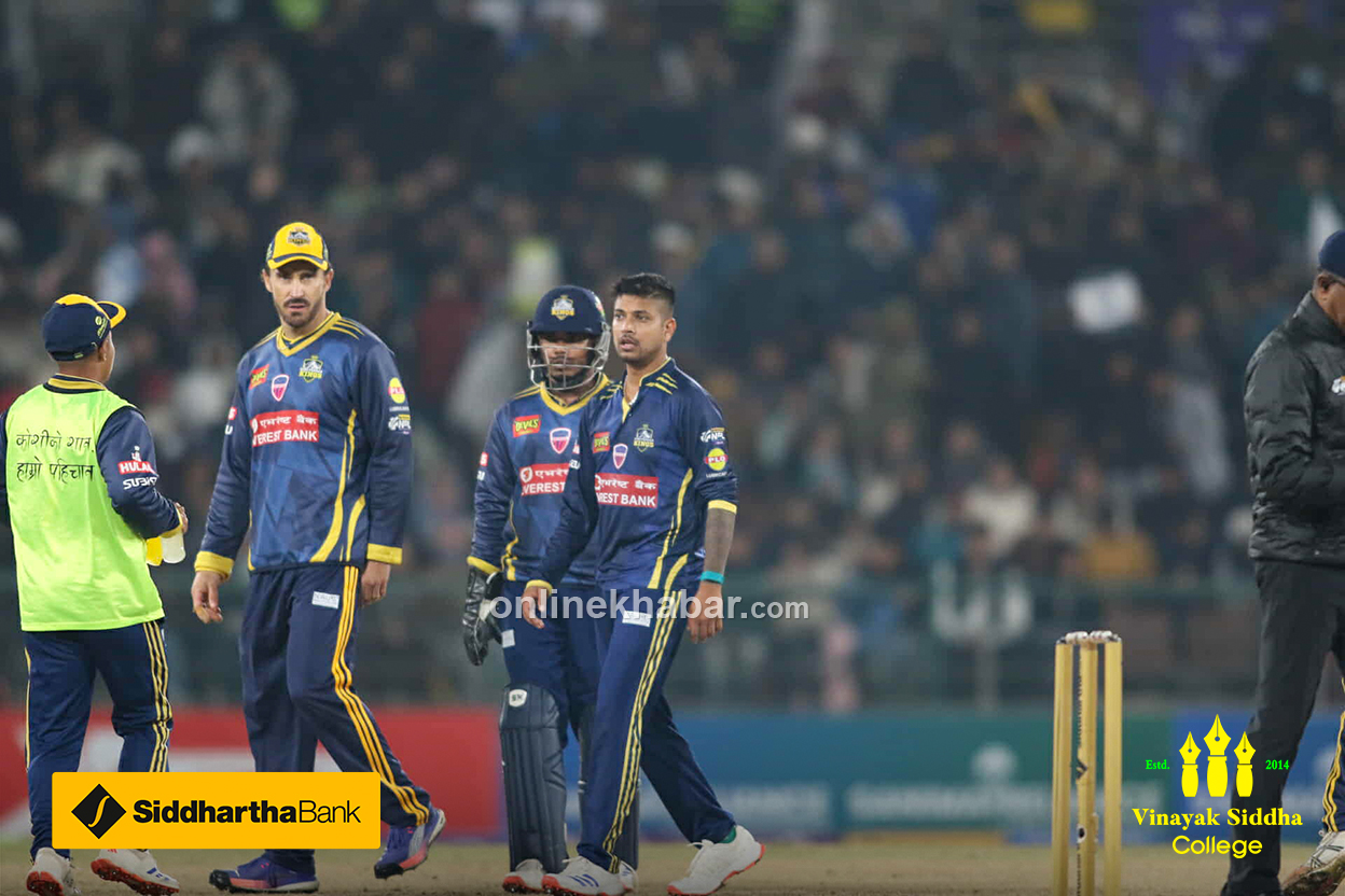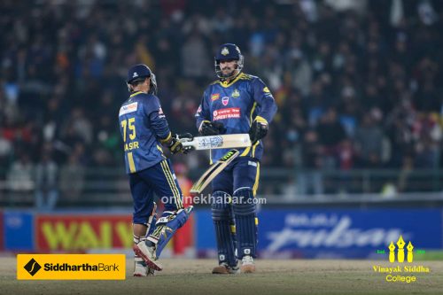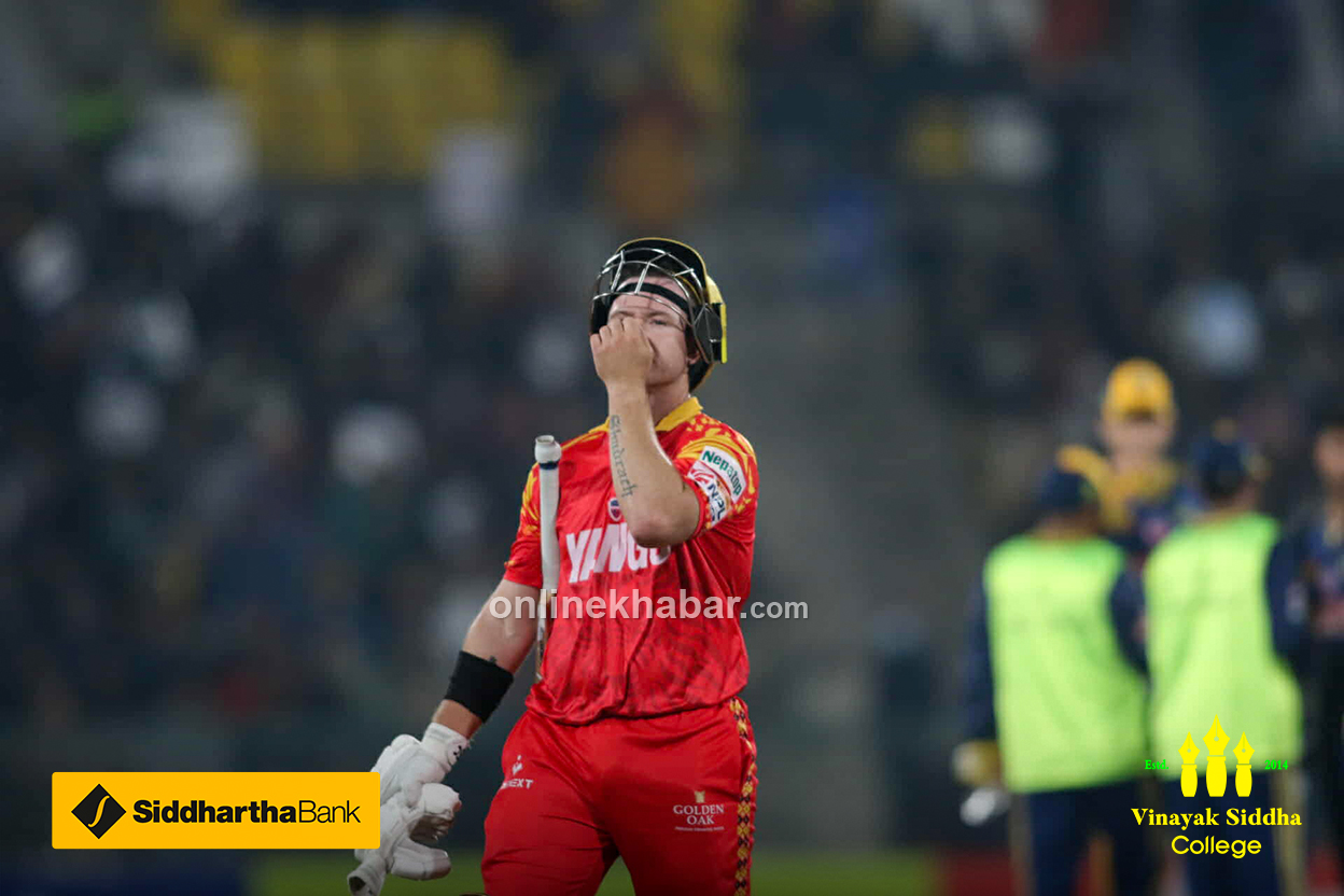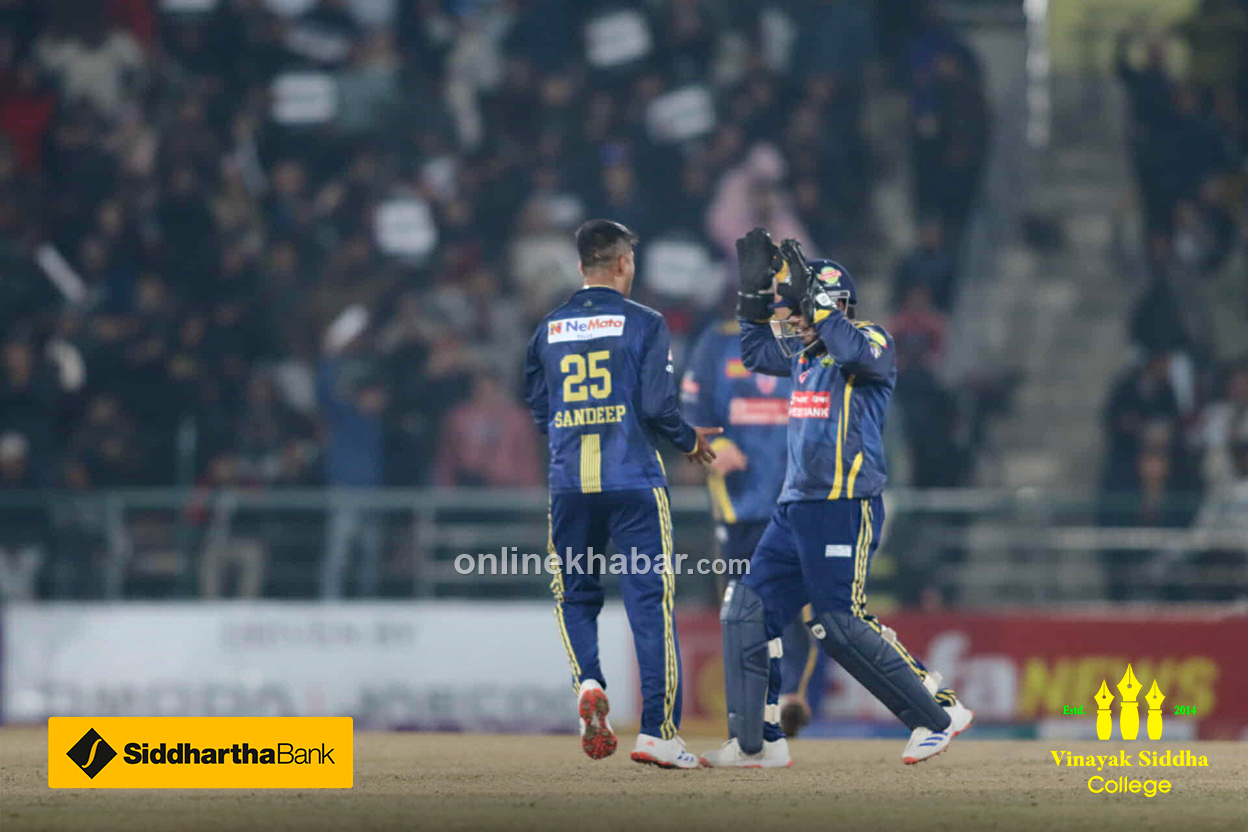 योसँगै आजको खेलको बल बाइ बल अपडेटबाट बिदा माग्न चाहन्छौं । भोलि दुई खेल हुँदैछन् । पोखरा एभेन्जर्स र काठमान्डु गोर्खाज तथा सुदूरपश्चिम रोयल्स र चितवन राइनोज खेल्दै छन् । बल बाइ बल अपडेट लिएर उपस्थित हुनेछौं । त्यतिन्जेल अनलाइनखबर फलो गर्दै गर्नुहोला । नमस्कार, शुभ रात्रि ।