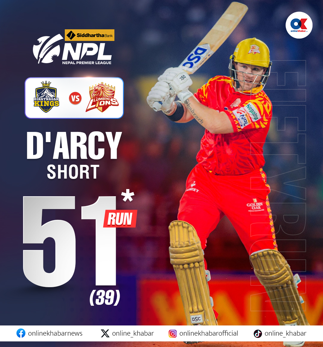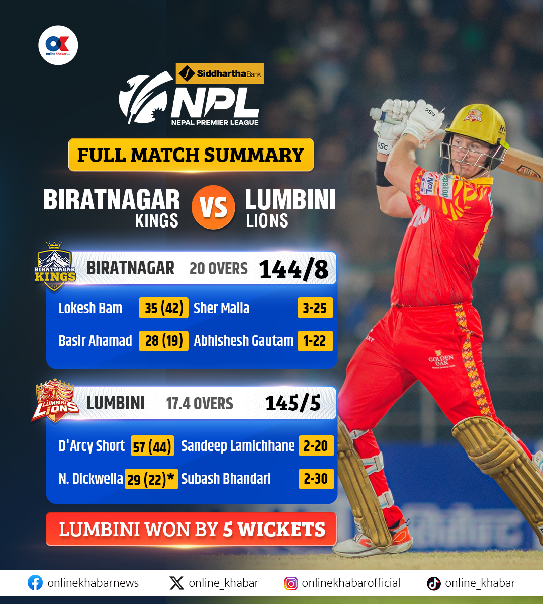 अष्ट्रेलियन ब्याटर डार्शी सर्टले एनपीएलमा पहिलो अर्धशतक प्रहार गरेपछि लुम्बिनी लायन्सले लगातार दोस्रो जित हात पारेको हो । उनले ५७ रन जोडे । निरोशन डिकवेलाको आगमनपछि लुम्बिनीको मिडल अर्डर राम्रो देखिएको छ । आजपनि डिकवेलाले अविजित २९ रन योगदान गरे । यस्तै चौथो नम्बरमा ब्याटिङ गरेका सन्दिप जोराले पनि २४ रन योगदान गरे । बलिङमा विराटनगरका कप्तान सन्दीप लामिछानेले र सुभाष भण्डारीले २-२ विकेट लिए । लुम्बिनीले अब आफ्नो अन्तिम लिग खेल जनकपुर बोल्ट्ससँग खेल्नेछ । उक्त खेलमा जितेमा प्लेअफ पुग्ने सम्भावना कायम छ ।
