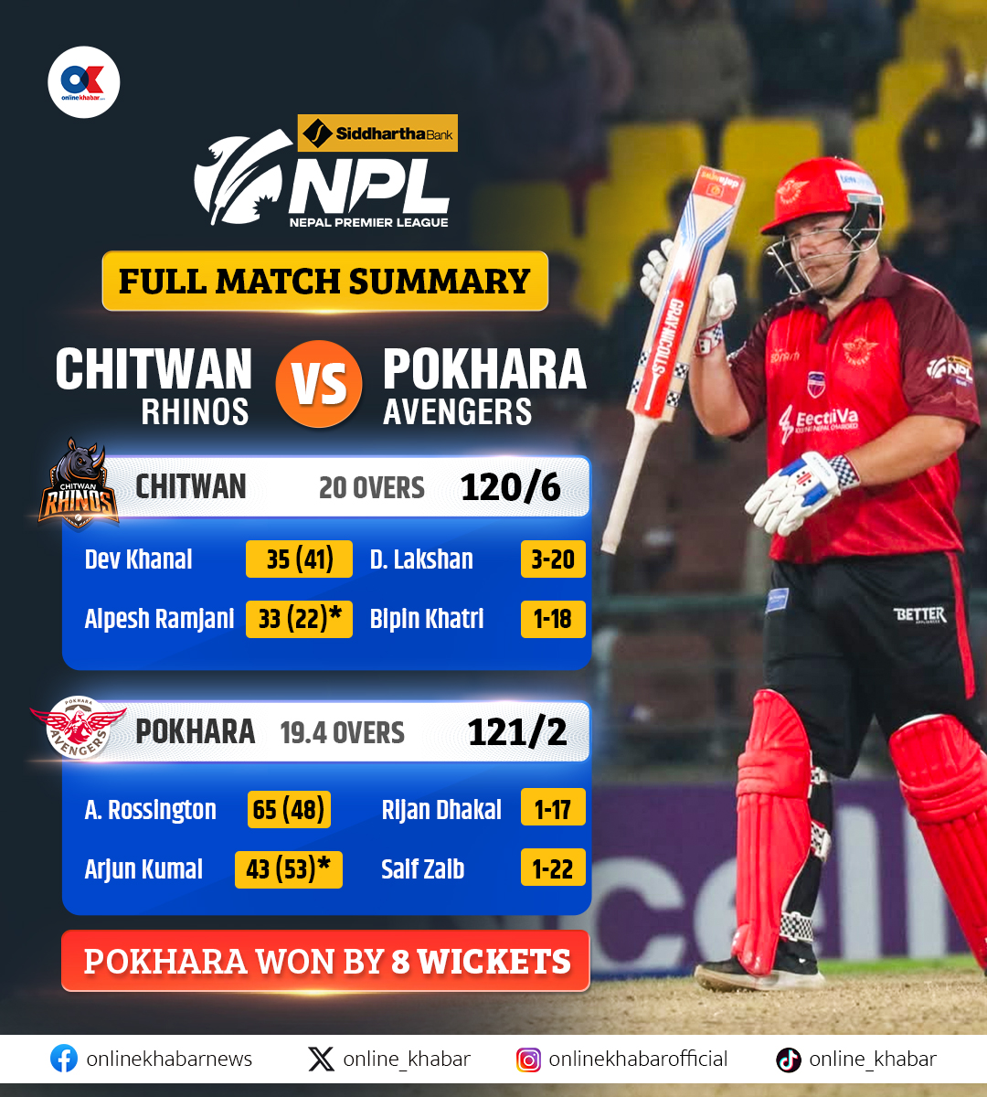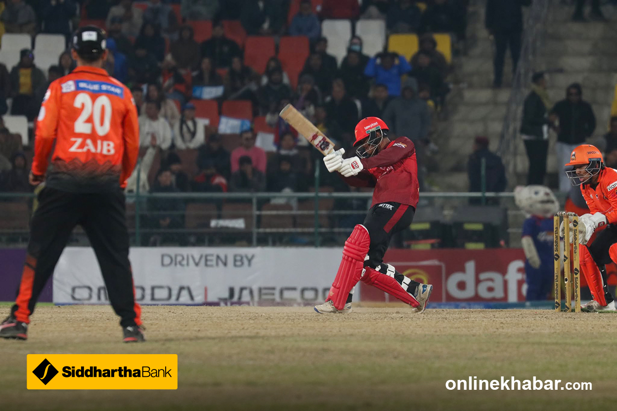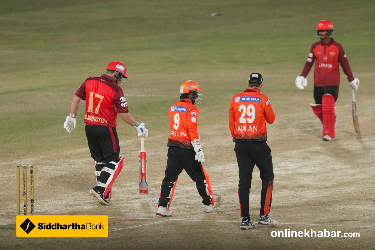 १२१ रनको लक्ष्य पोखराले अन्तिम ओभरसम्मै खेललाई पुर्याएर पूरा गरेको छ । ओपनर एडम रोसिङटनले ठूला शटहरू खेल्दा अर्जुनले संयमित ब्याटिङ गरे । रोसिङटन ६५ रनमा आउट भए भने अर्जुन ४३ रनमा अविजित रहे ।